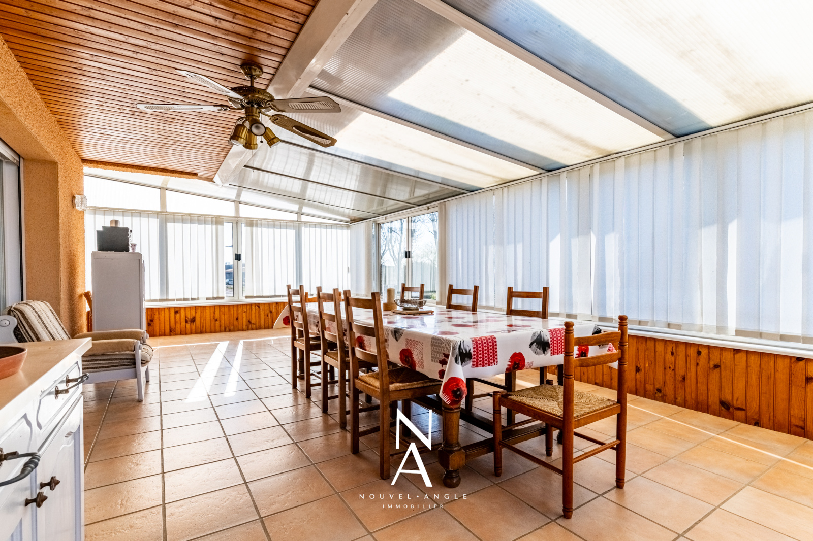 Elle est composée au rdc d'une entrée, d'un salon / salle à manger d'environ 40m2, d'une cuisine fermée de 15,5m2 (possibilité d'ouvrir la cuisine sur la salle), de 3 chambres, d'une salle de douche et d'un toilette séparé. La terrasse d'environ 32m2 accesible depuis la salle et la cuisine est totalement fermée avec des baies coulissantes.