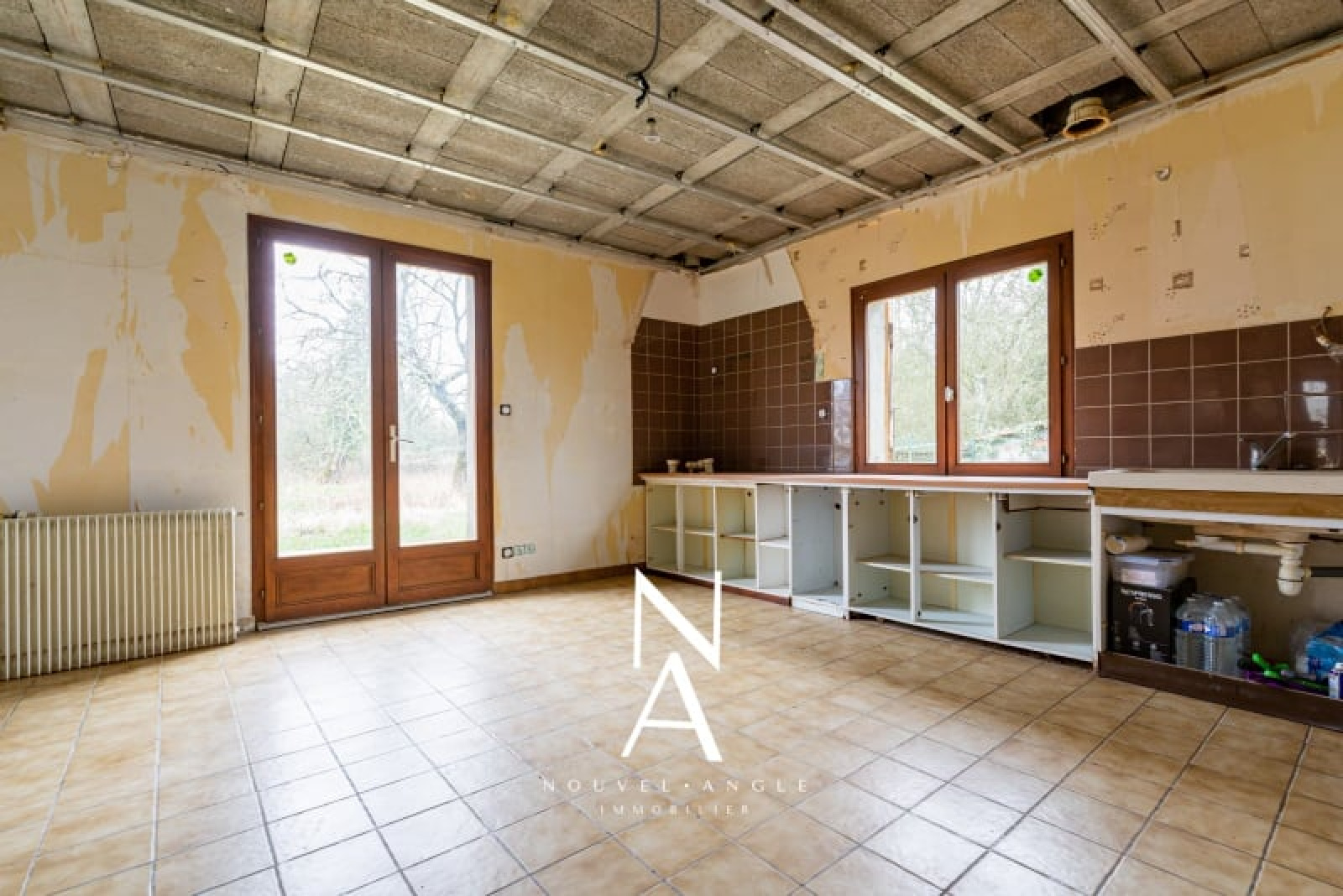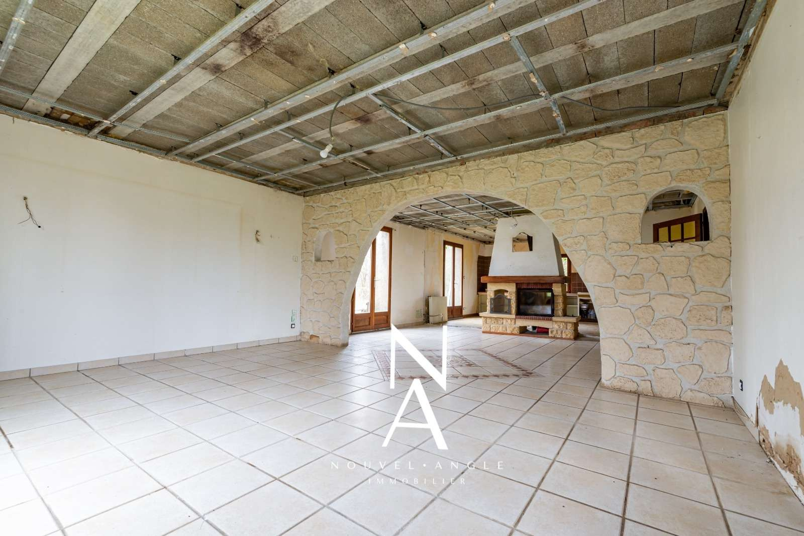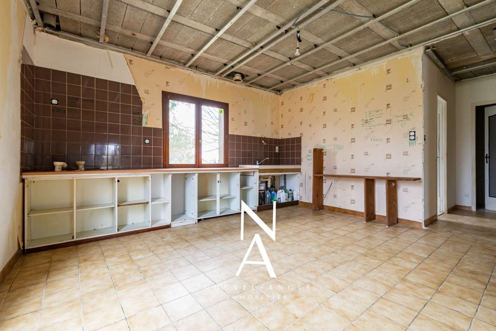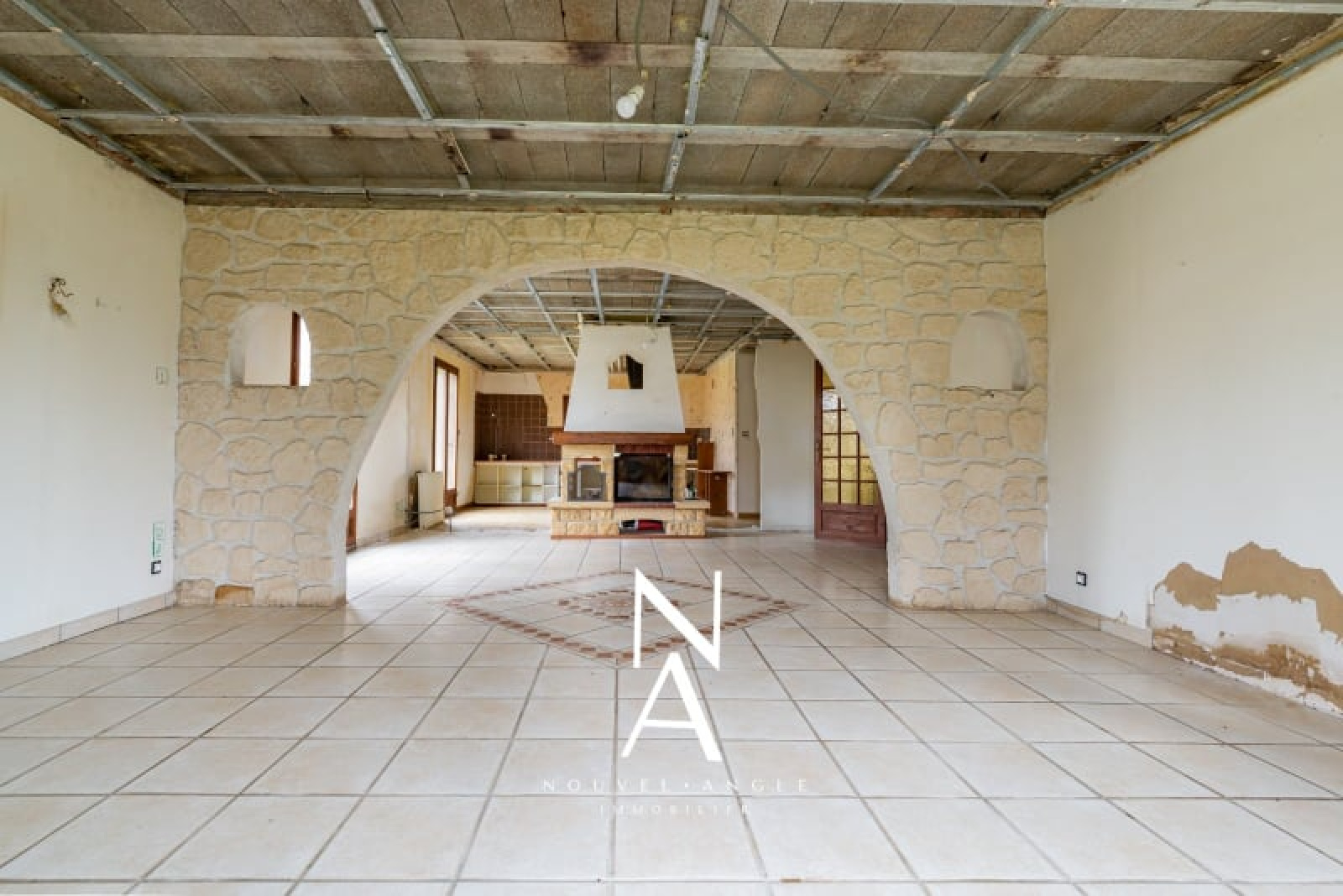 Maison de plain-pied à rénover, 135 m² habitables comprenant; salon/séjour sur cuisine ouverte avec cheminée centrale, 4 chambres, salle de bain, WC. À la suite, la chaufferie, l'accès grenier et le garage double.